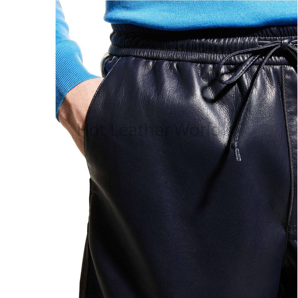Be the first to review “Navy Blue Elasticized Waist Side Slit Pockets Men Faux Leather Shorts”